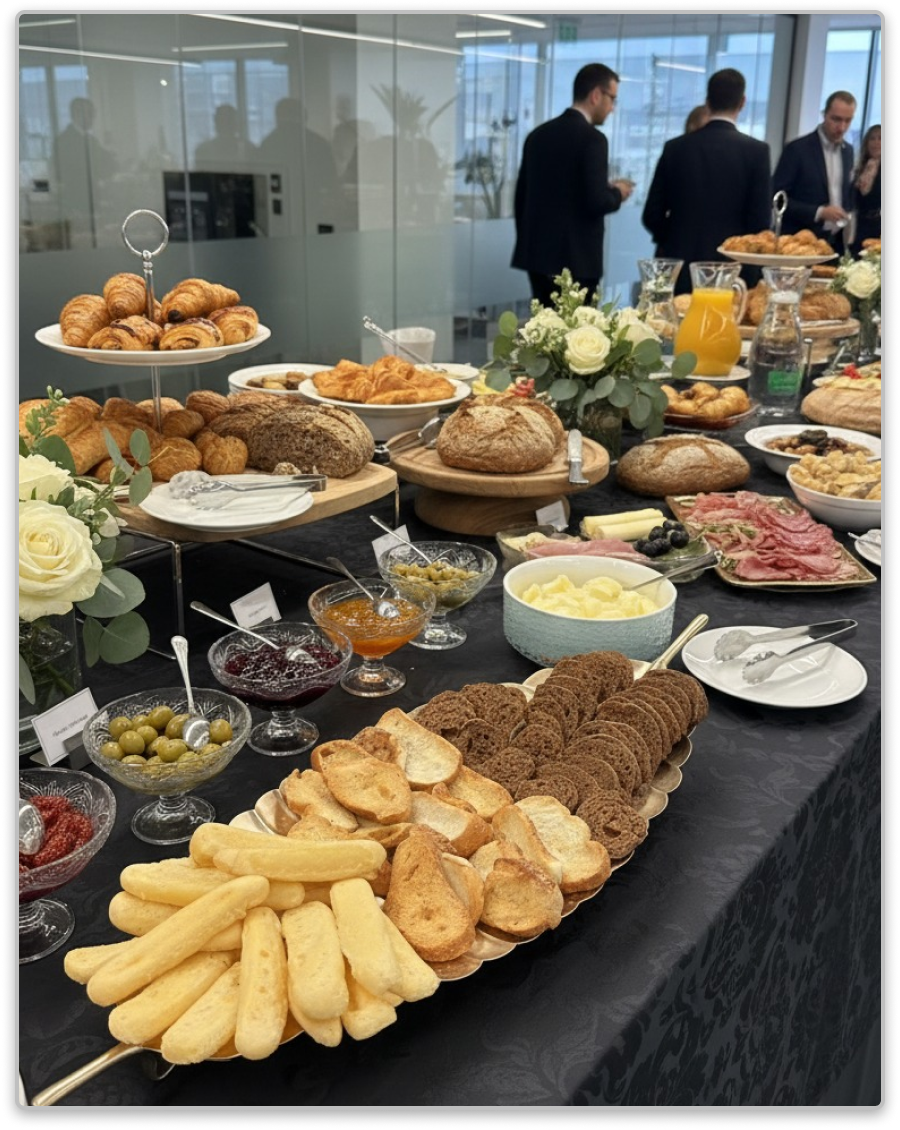 - Grazing Tables: Mesas postas decoradas com Pães variados, Chips, Nachos, Tábuas de Frios e Queijos Finos, Nut Mix, Frutas Secas, Terrines e Saladas no copo.